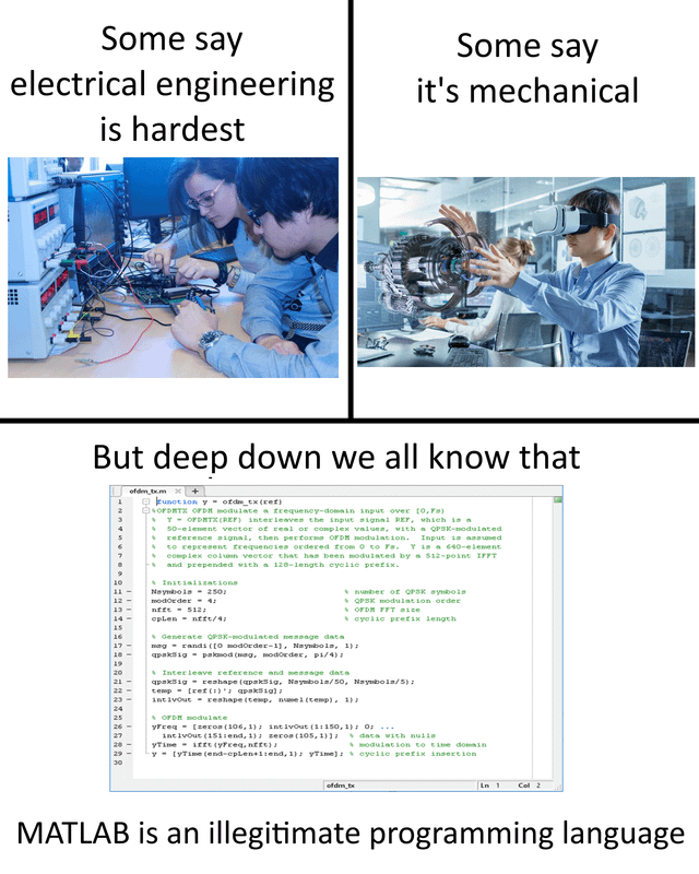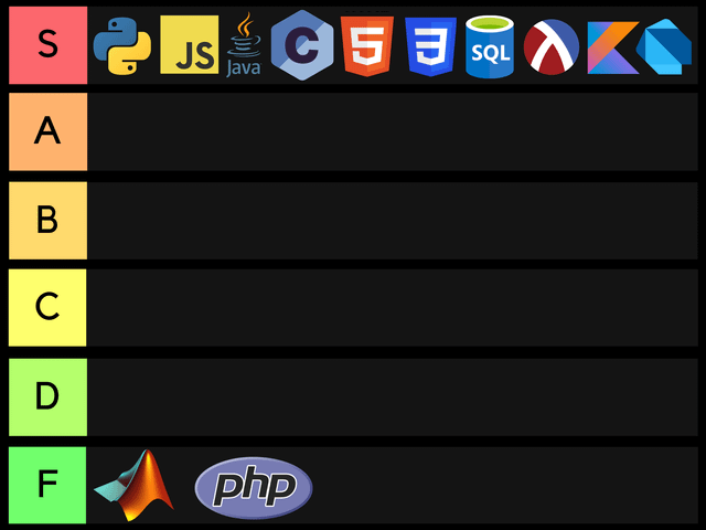 A notable meme that I came across in the community was the programming tier list. People would rank their favourite programs from S tier (best) to F tier (worst). Of course, many opinionated lists were put out, but what wasn’t controversial was how low or absent MATLAB was in most people’s lists.